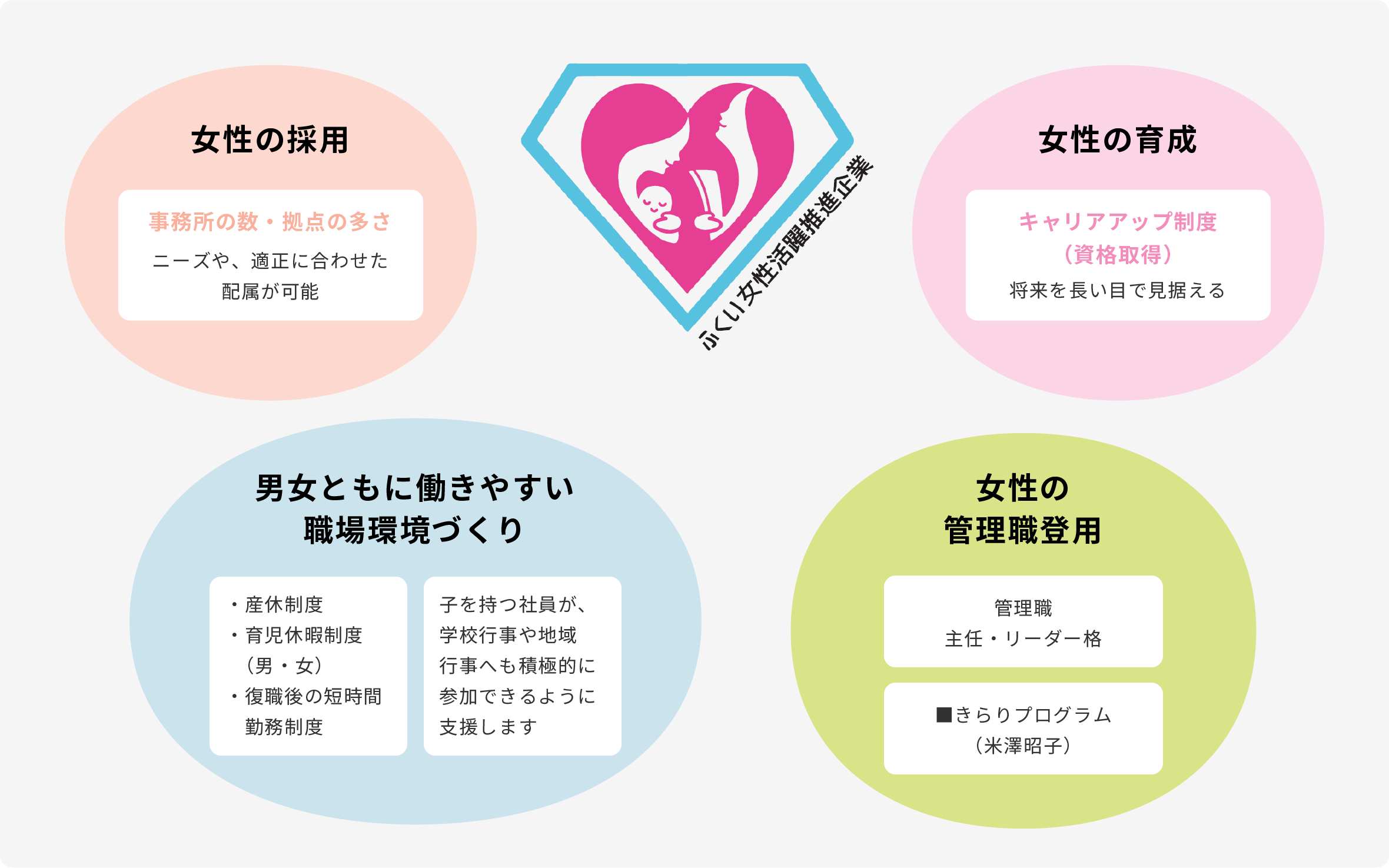 このような流れから、県が行う事業「ふくい女性活躍推進企業」に登録されております。